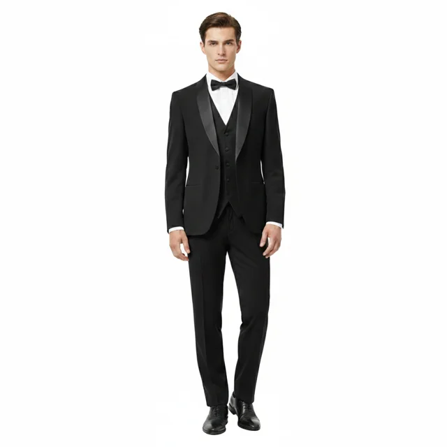 کت و شلوار مجلسی دامادی تک دکمه با یقه شال ساتن، مناسب آقایان خاص و خوش‌سلیقه. طراحی شیک و کلاسیک این لباس، ظاهری منحصر به فرد و رسمی به شما می‌بخشد و برای مراسم‌های مهم بهترین انتخاب است. راحتی و زیبایی در کنار هم.